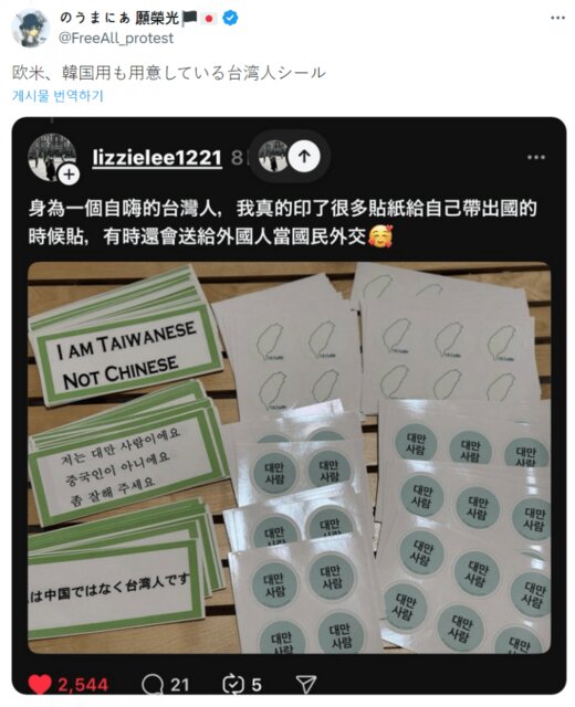 ステッカーには「私は台湾人です。中国人ではありません。ちょっと優しくしてください」「台湾人」という言葉が韓国語、英語、日本語など