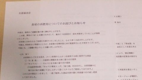 廃棄しないで別の器に再度盛り付けて、使い回していたという。この公表内容に関して、様々な憶測が飛び交っている。