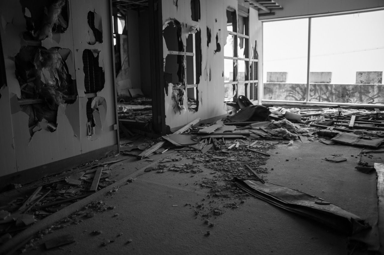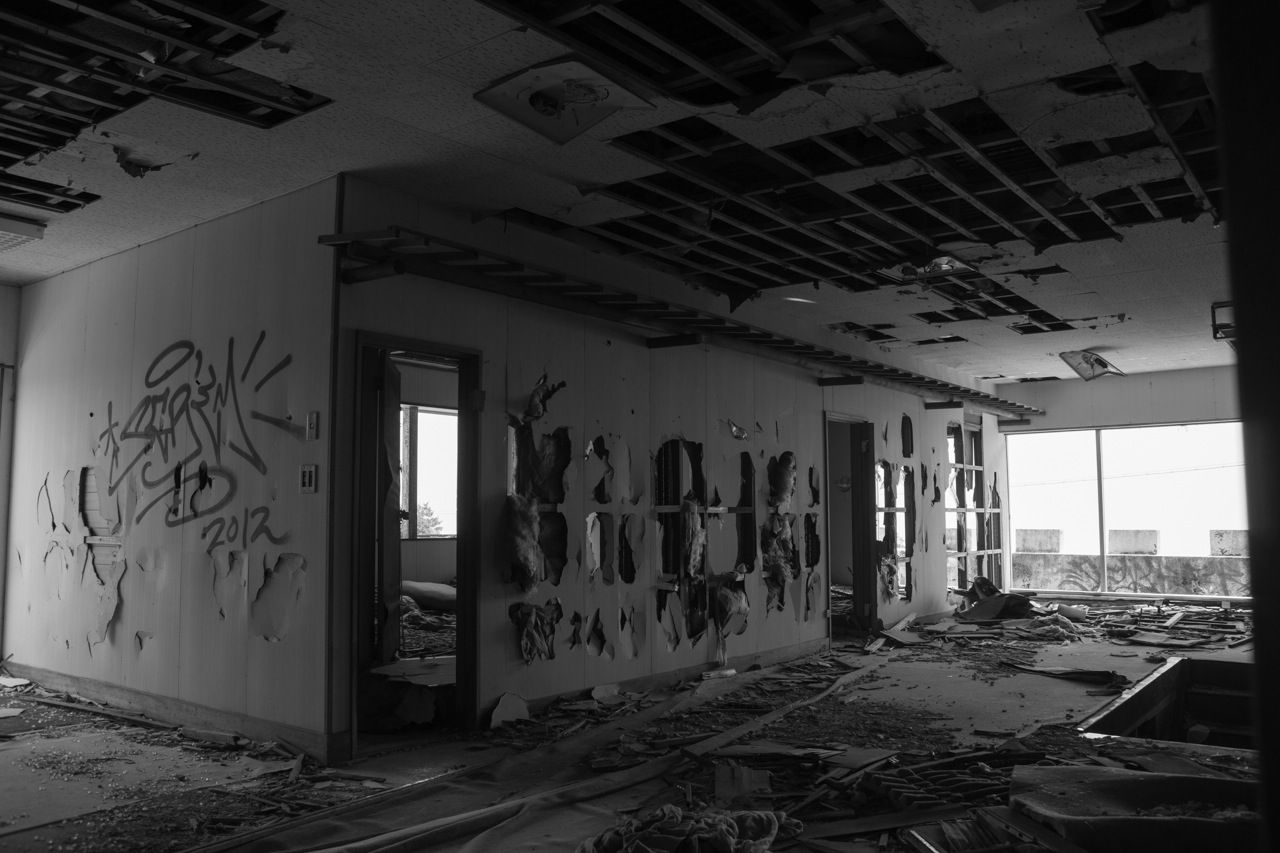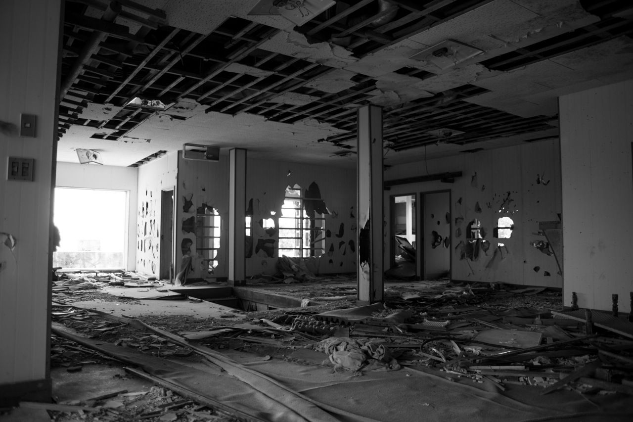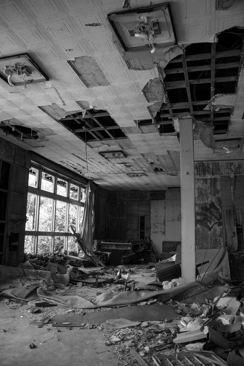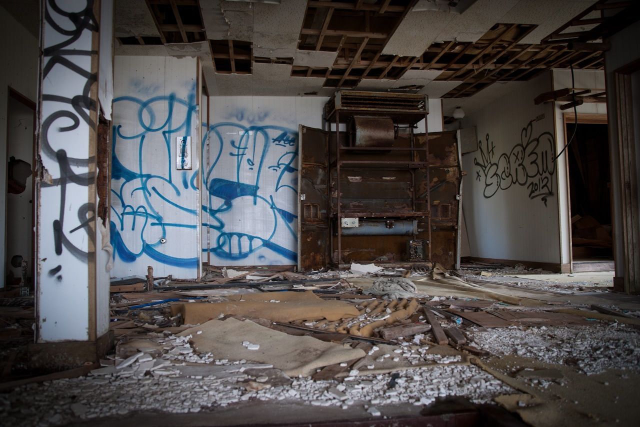 天井のヤレ具合が半端ない。壁もガラスもズッタズタになってる。