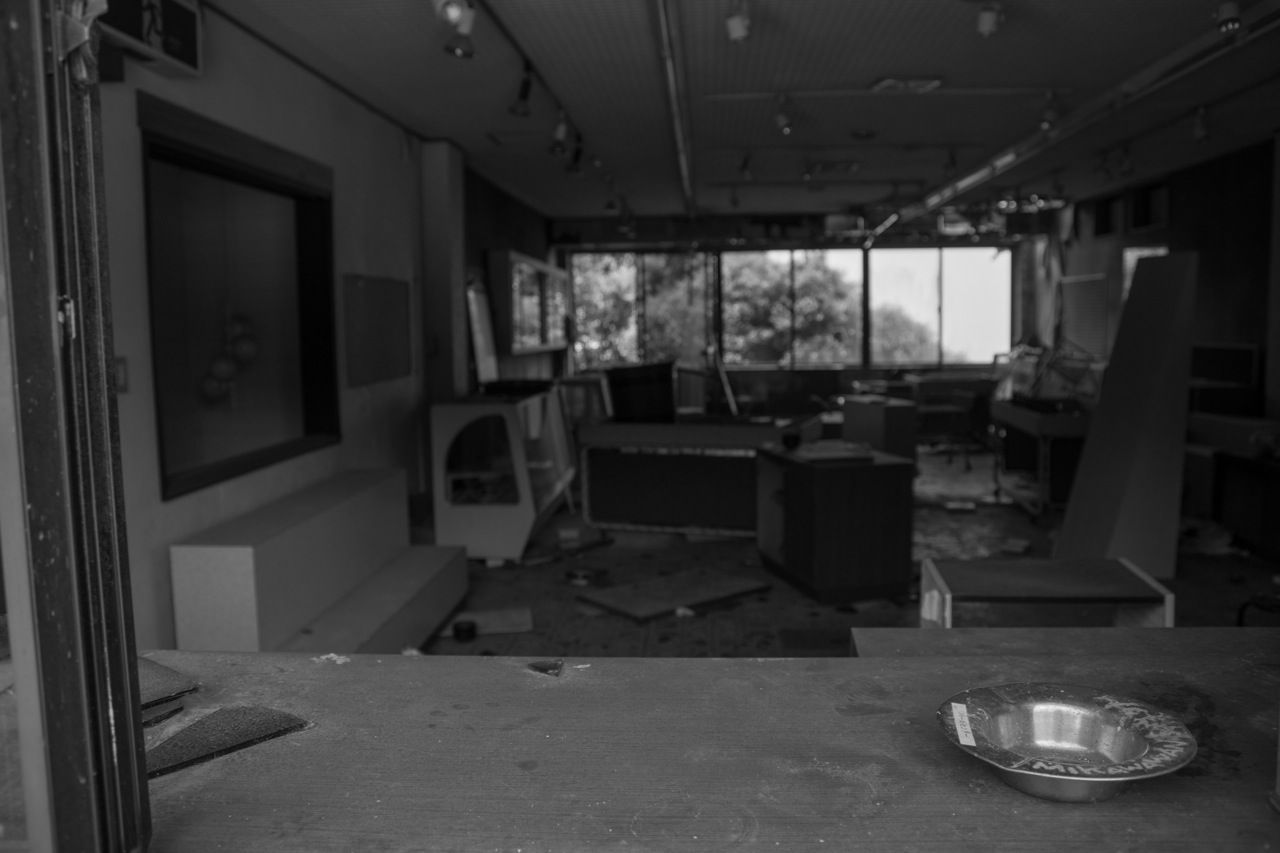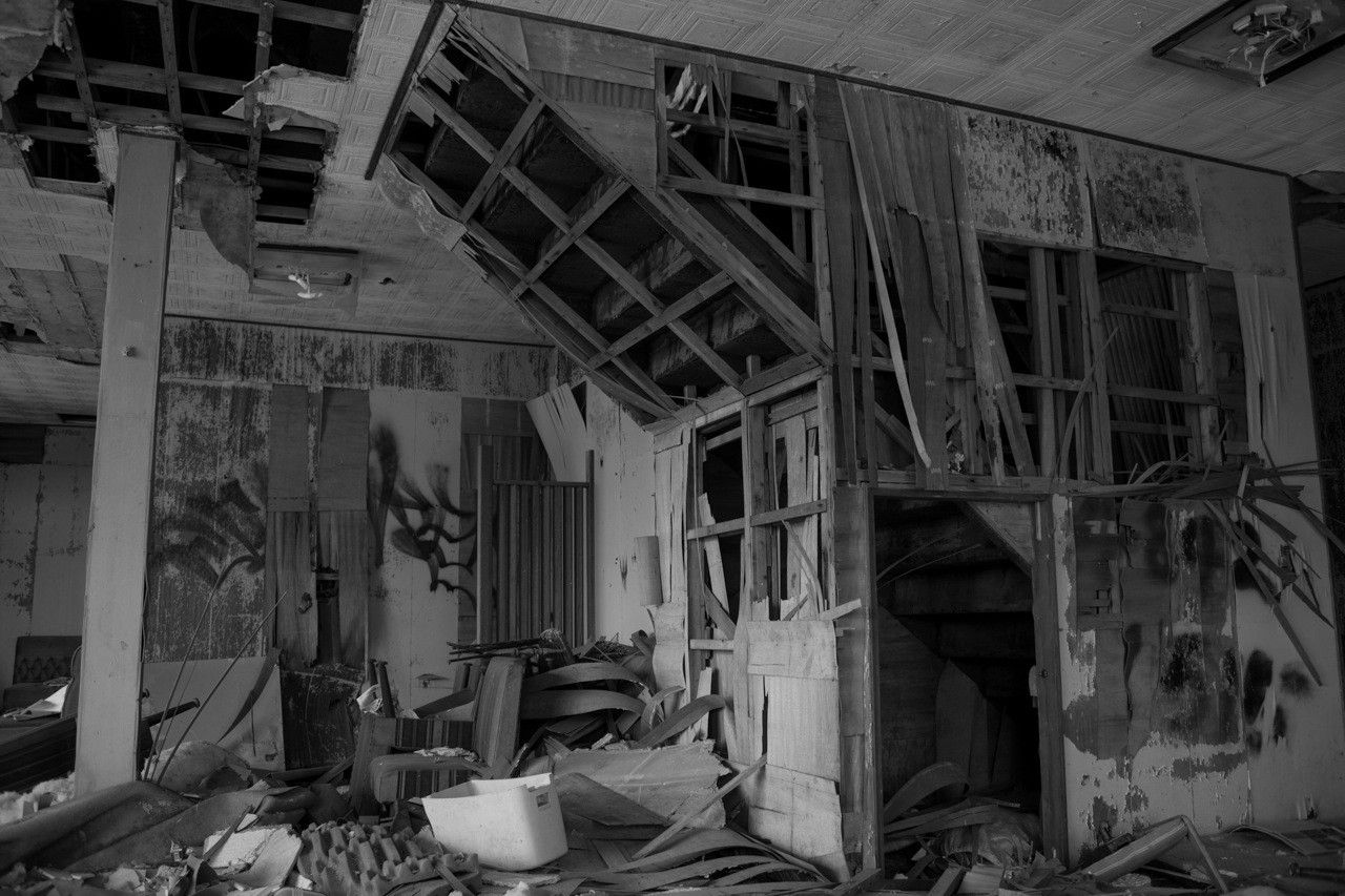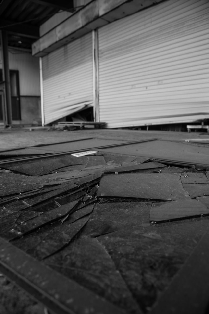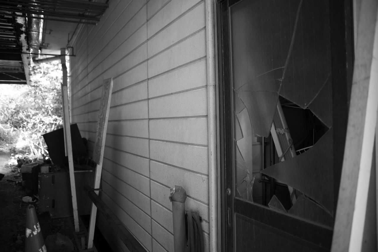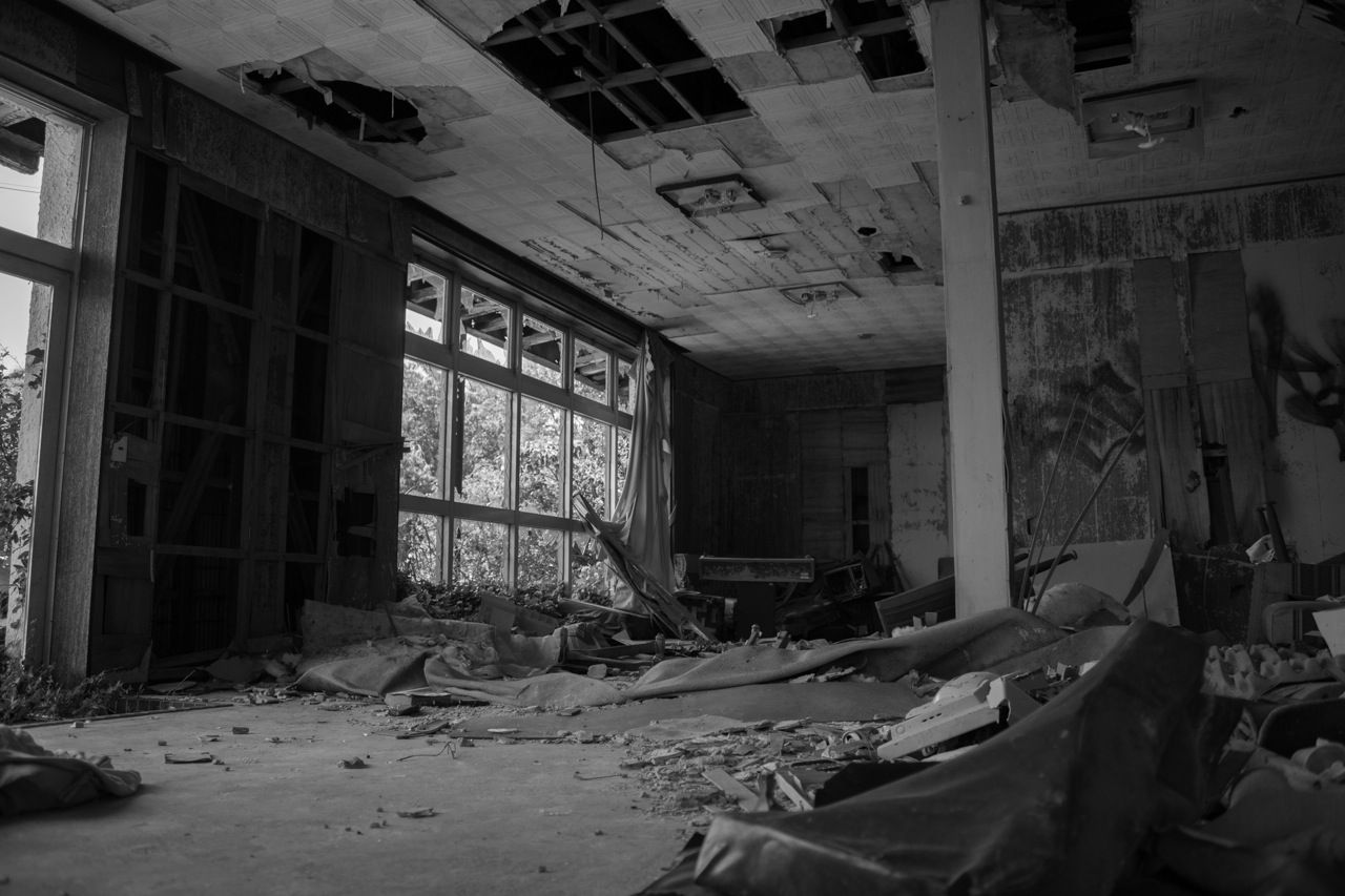 天井のヤレ具合が半端ない。壁もガラスもズッタズタになってる。