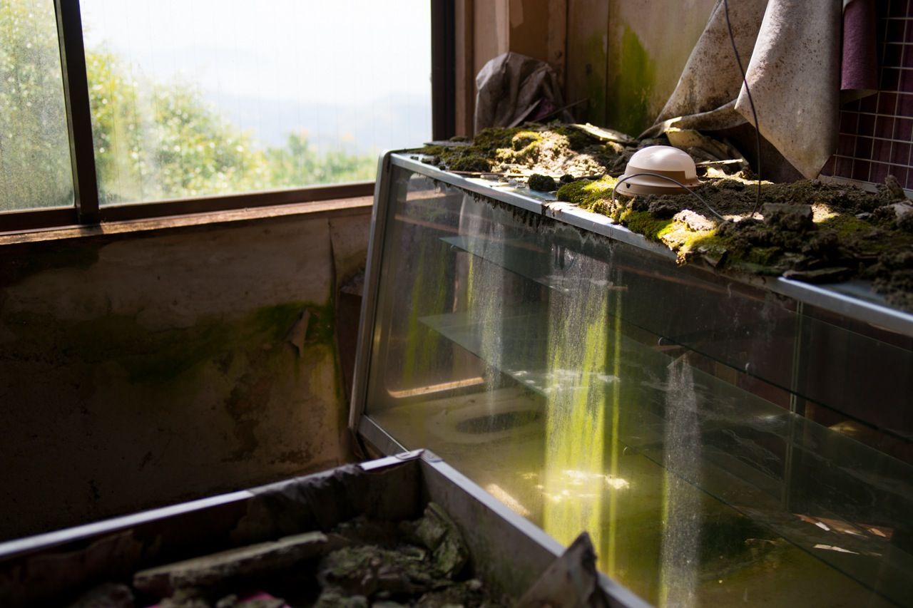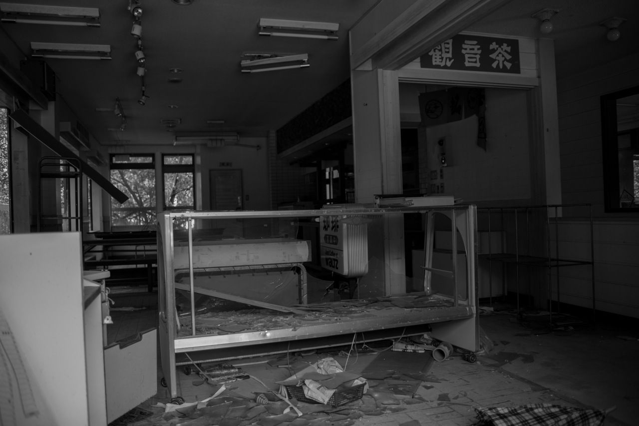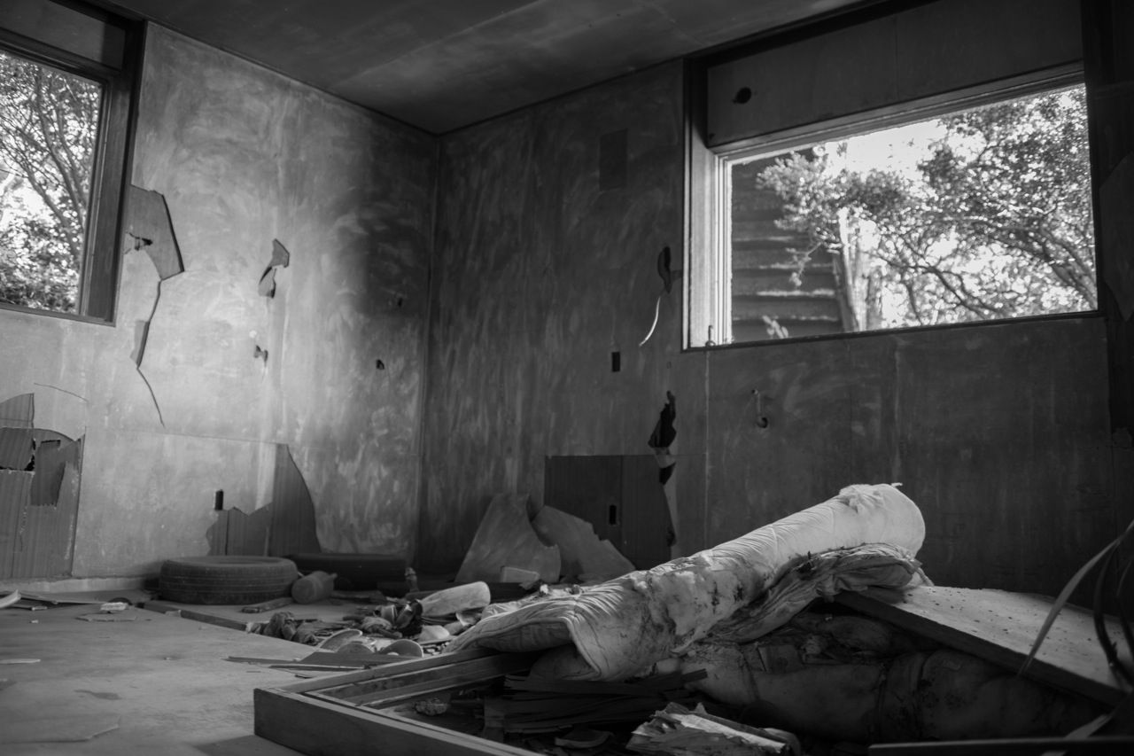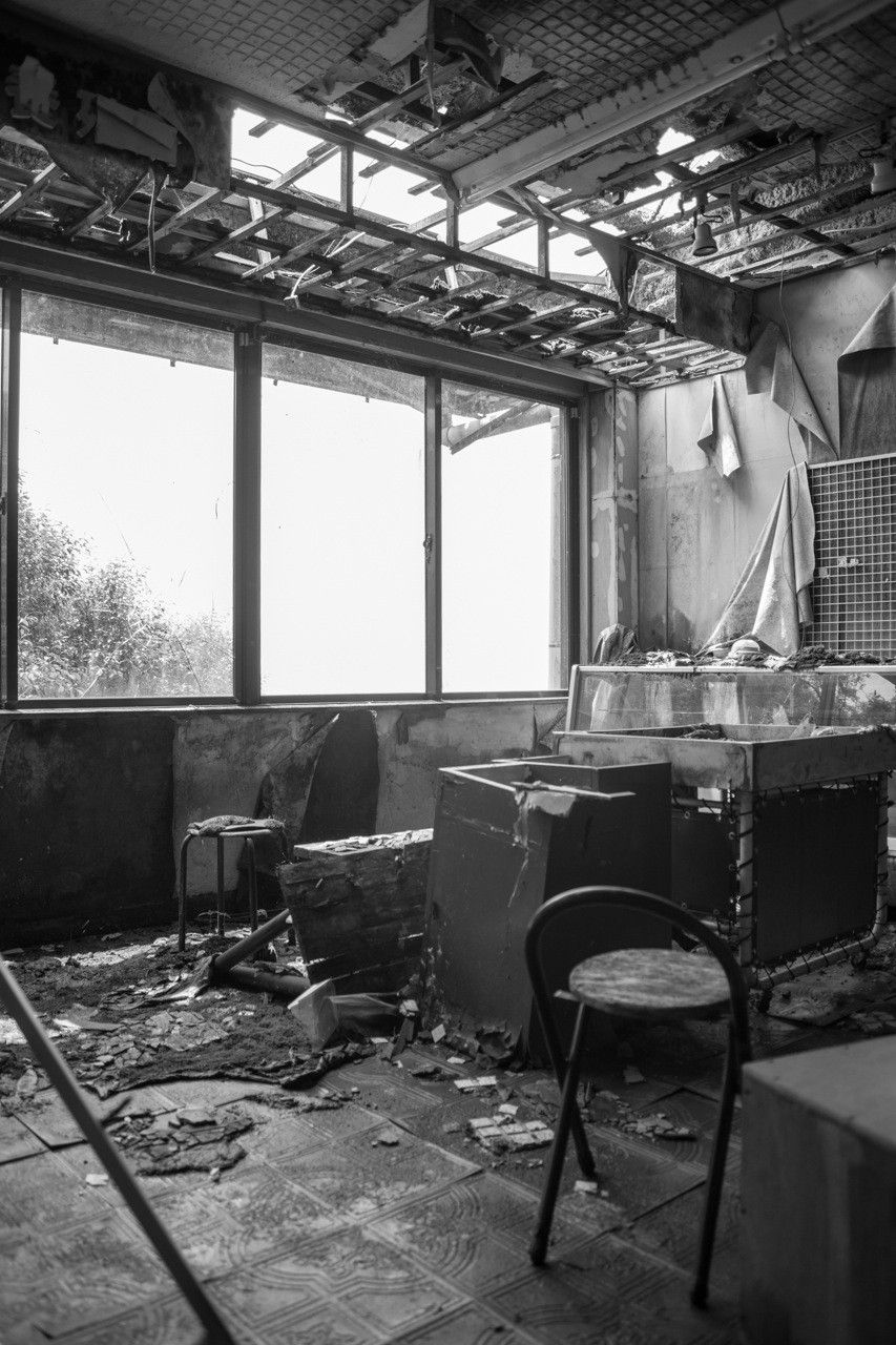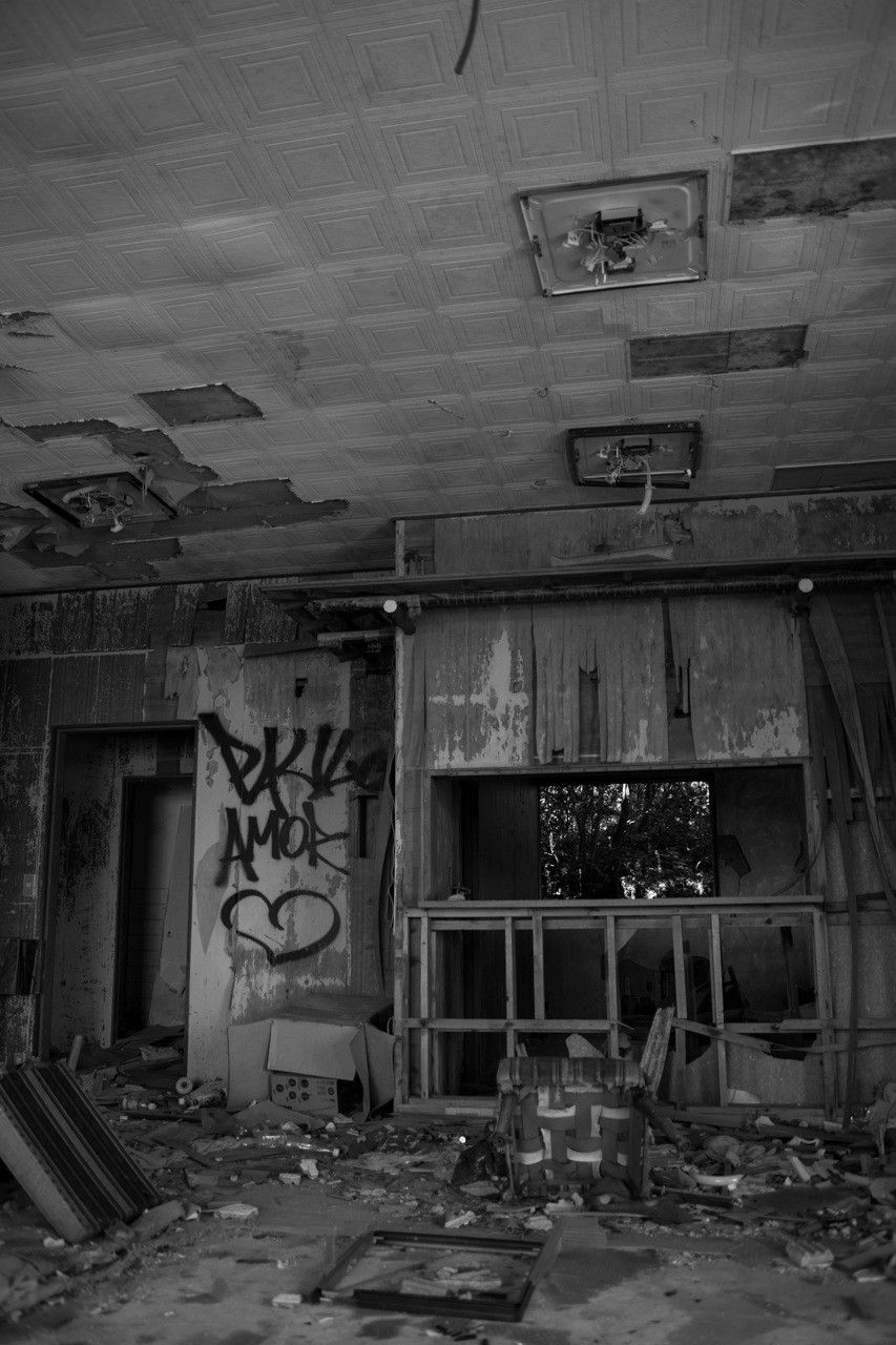 天井のヤレ具合が半端ない。壁もガラスもズッタズタになってる。