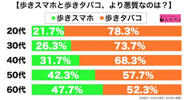 全体では2倍近くの差が開いて、条例でも規制が進む「歩きタバコのほうが悪い」という結果となった。しかし、「タバコに比べたら歩きスマホは