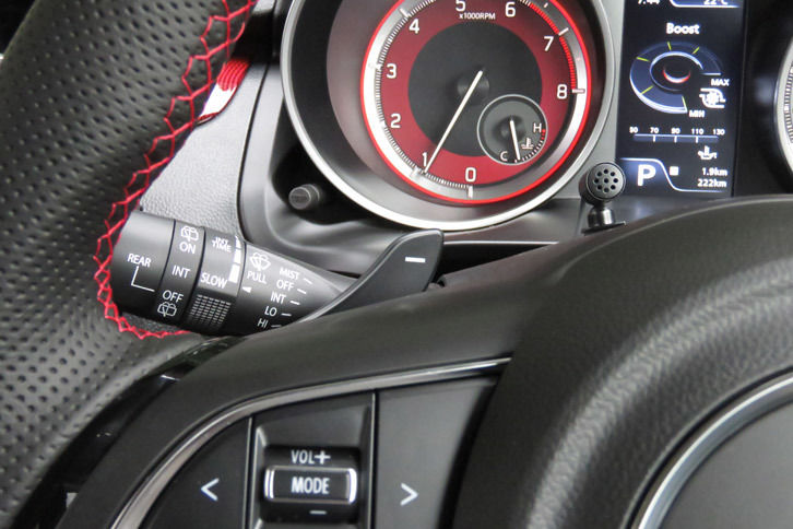 拡幅により安定感を増したエクステリアは、逆スラントした大開口のハニカムグリルやルーフエンドリアスポイラー、存在感のあるデュアルエキゾーストパイプなどでスポーティーに装う。インテリアはスポーツドライビングをサポートすべく、メーター、ステアリングホイール、シート、ペダルプレートなどを専用開発。マルチインフォメーションディスプレイには、新たにブースト計と油温計を追加している。