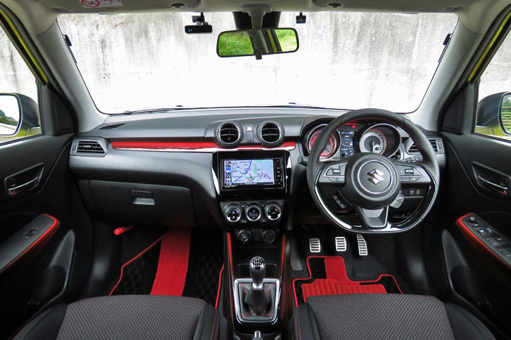 ボディーサイズは全長×全幅×全高=3890×1735×1500mm、ホイールベース2450mm。旋回性能を高めるべく前後トレッドをそれぞれ30mm拡大したため、全幅が1.7mを超えてスイフトとしては初の3ナンバーサイズとなった。とはいうものの、実は1735mmという全幅は海外向けのスイフトと同じ。国内向けのノーマルのスイフトのみ、5ナンバーサイズにおさめるためにダウンサイズしているのである。
