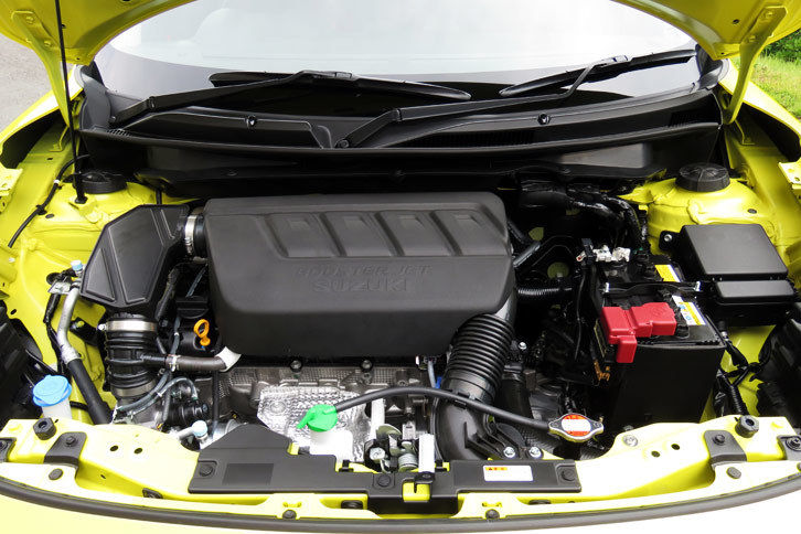 エンジンは1.4リッター直4直噴ターボのK14C型ブースタージェット。すでに「エスクード1.4ターボ」に積まれているユニットをベースに専用チューニングを施したもので、最高出力140ps/5500rpm、最大トルク230Nm/2500-3500rpmを発生。いずれも先代の自然吸気1.6リッターを上回り、0-100km/h発進加速は先代よりMT車で約20%、AT(先代はCVT)車で約25%向上しているという。いっぽう燃料消費はJC08モードで16.0km/リッター(6MT)と、先代(14.8km/リッター)より低減している。なお使用燃料はプレミアムガソリンである。トランスミッションはクロスレシオの6段MTと、先代のCVTに代わって、パドルシフトを備えたトルコン式の6段ATを用意している。駆動方式はFFのみである。