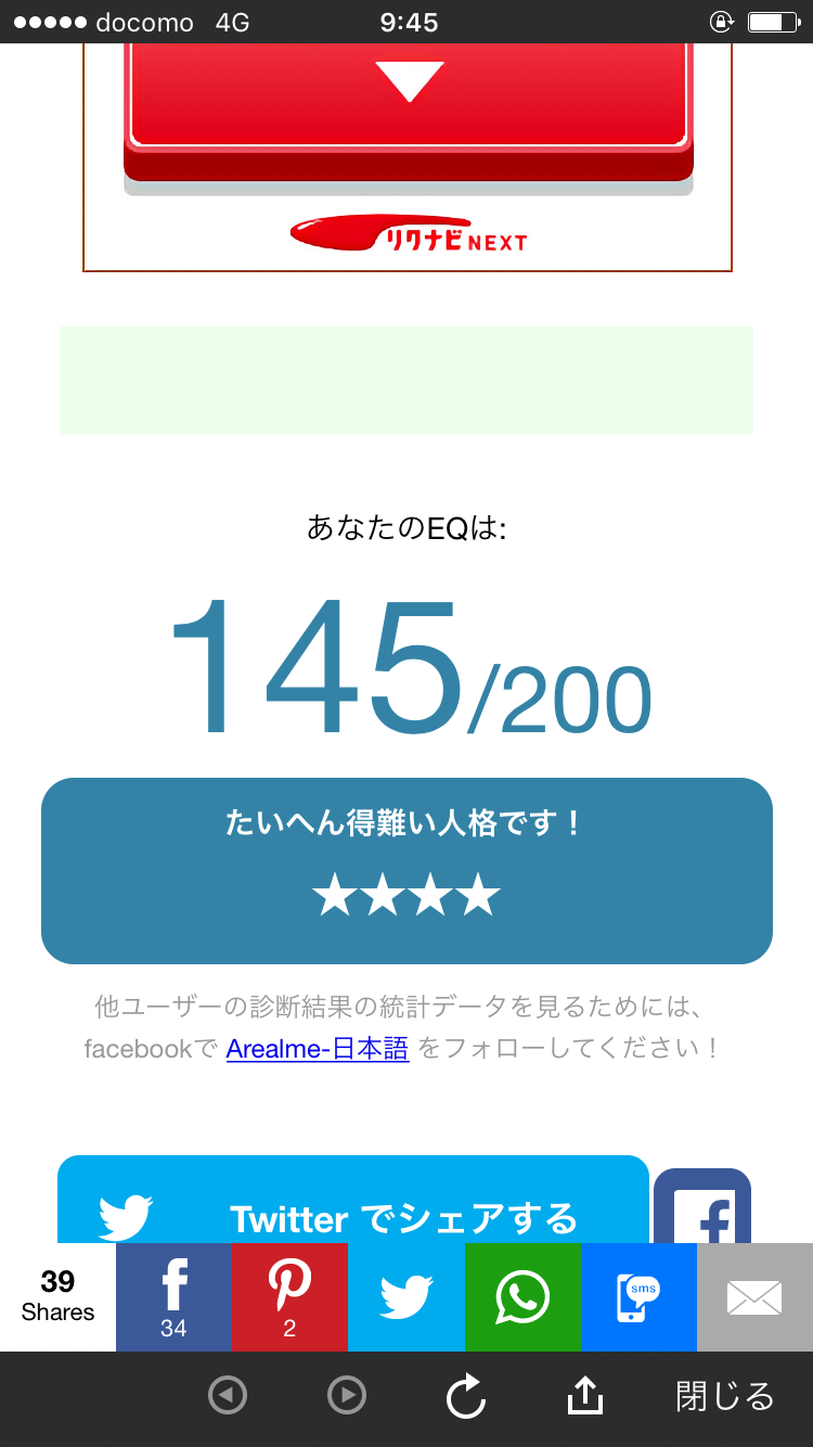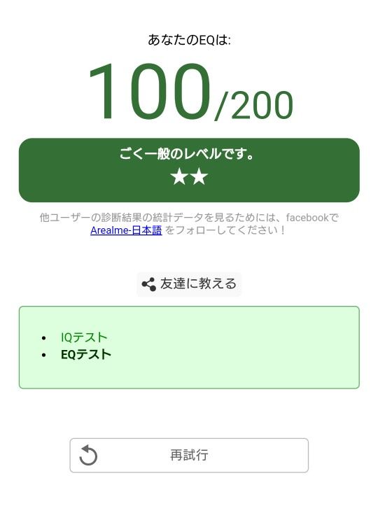 正確な測定のため、自分の心に正直な回答をして下さい。満点は200点、平均値は100点です。