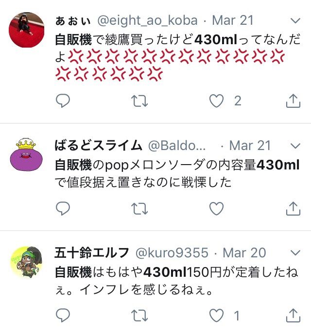 コンビニとかの飲み物も430が多くなっとるわ