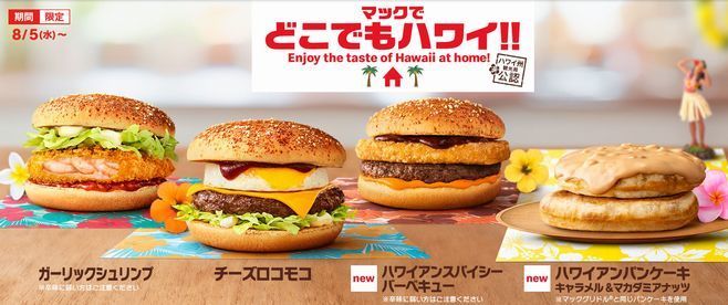 日本マクドナルドは8月5日から、「ハワイアンスパイシーバーベキュー」「ハワイアンパンケーキ キャラメル&マカダミアナッツ」など、“ハワイ州観光局公認”計8商品を全国の「マクドナルド」店舗で発売する。