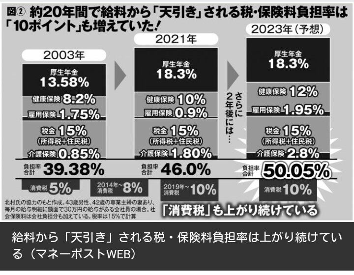 北村氏は2022年からの社会保険料値上げで、サラリーマンの税金と保険料を合わせた負担率は給料の50.05%になると予想している。